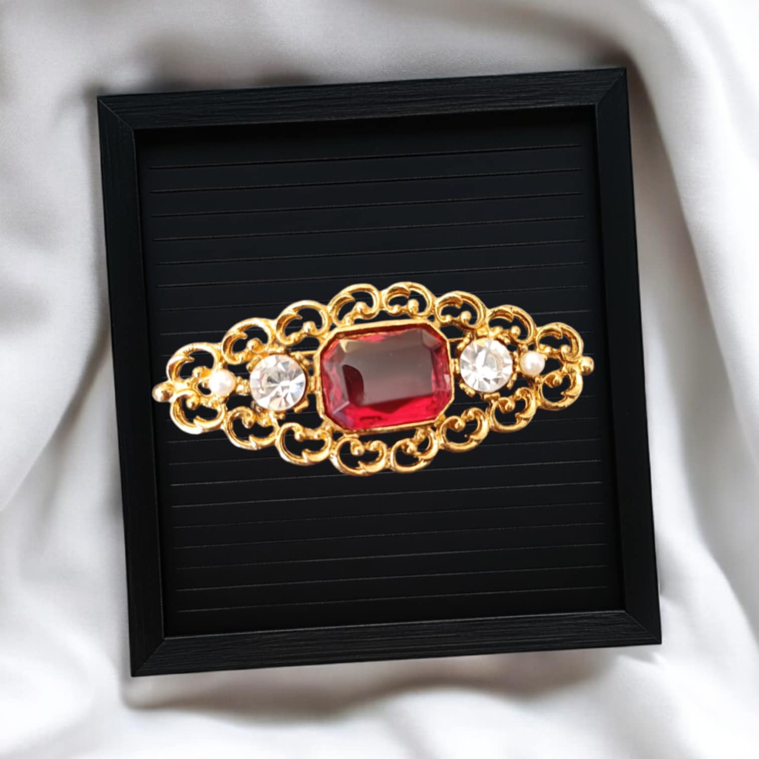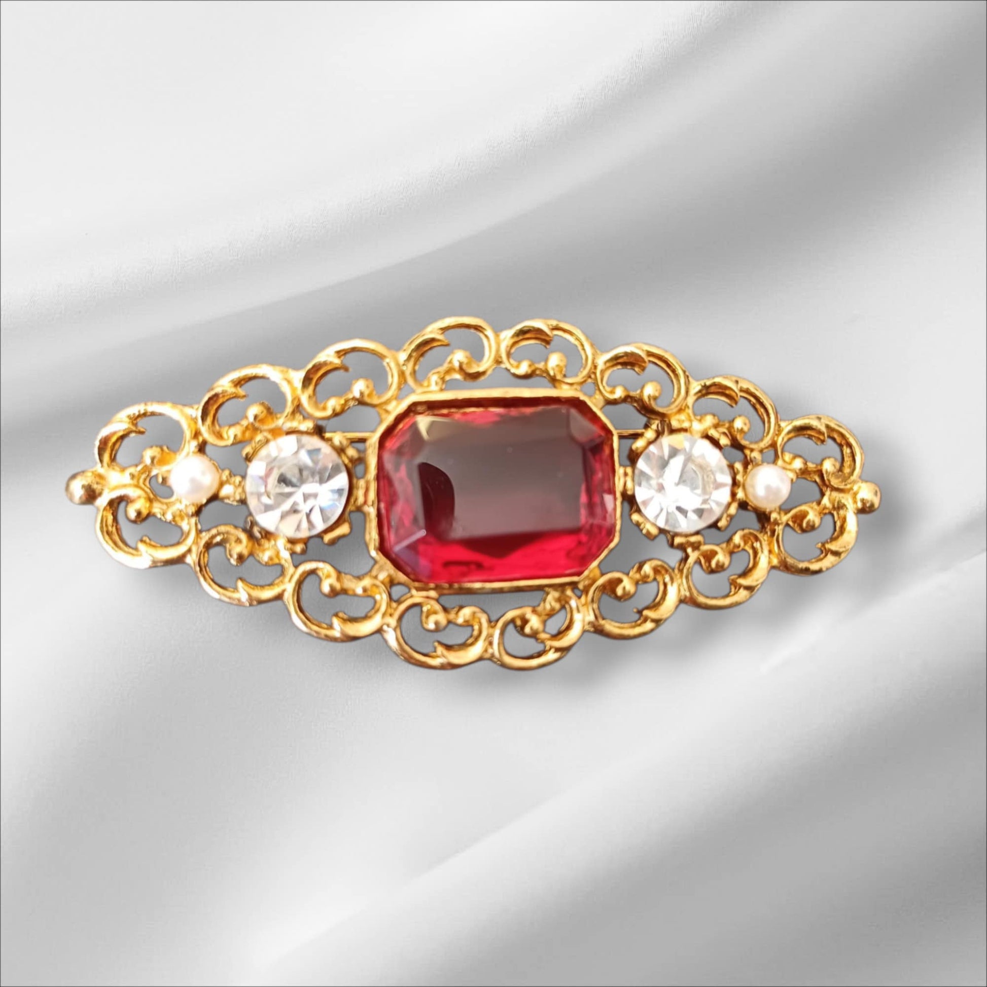 Denne utsøkte brosjen kombinerer klassisk eleganse med en dristig fargepalett. Den er utformet i en detaljert, gullfarget ramme, og prydes av en stor, rektangulær rød sten i midten – flankert av to klare krystaller og en liten perledetalj. Et ideelt smykke for deg som elsker vintagetilbehør.