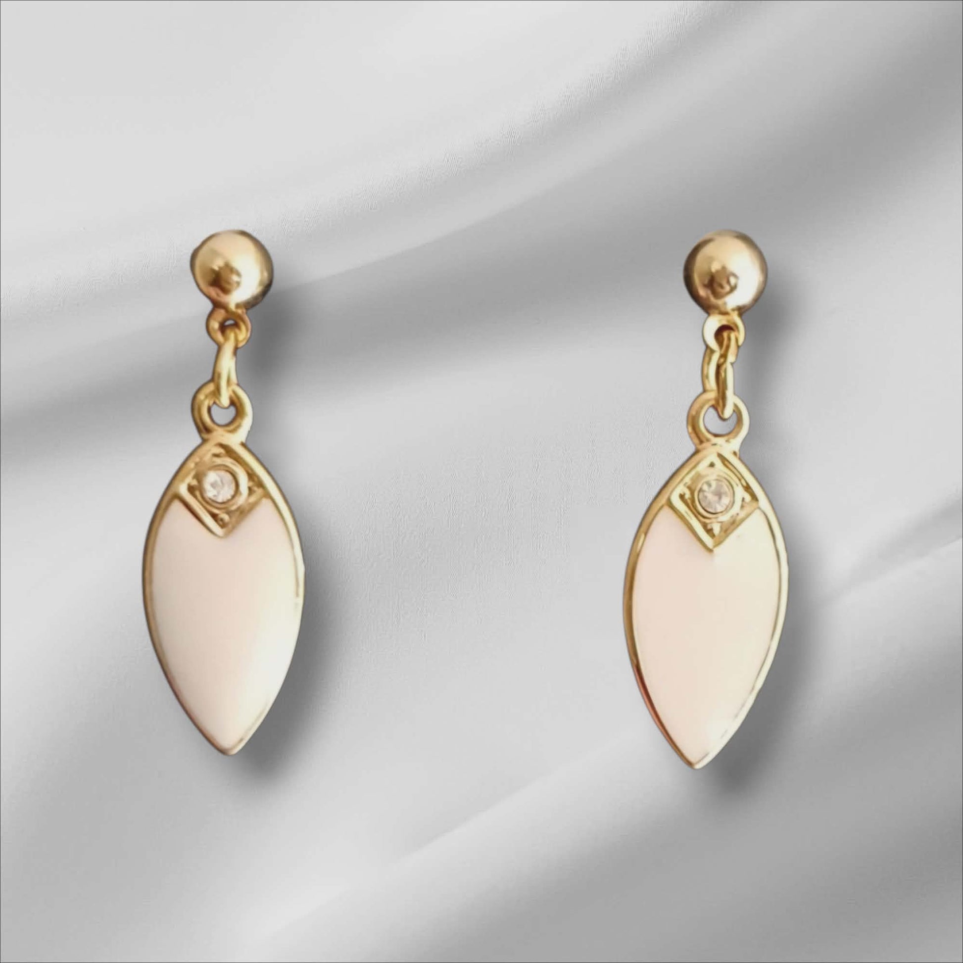 Disse elegante øredobbene har et lett, sofistikert uttrykk med sin slanke, bladlignende silhuett og varme gullfargede innramming. Den lyse, elfenbensfargede flaten gir et rolig og eksklusivt preg, mens den lille klare stendetaljen øverst tilfører et diskret, raffinert lysspill.