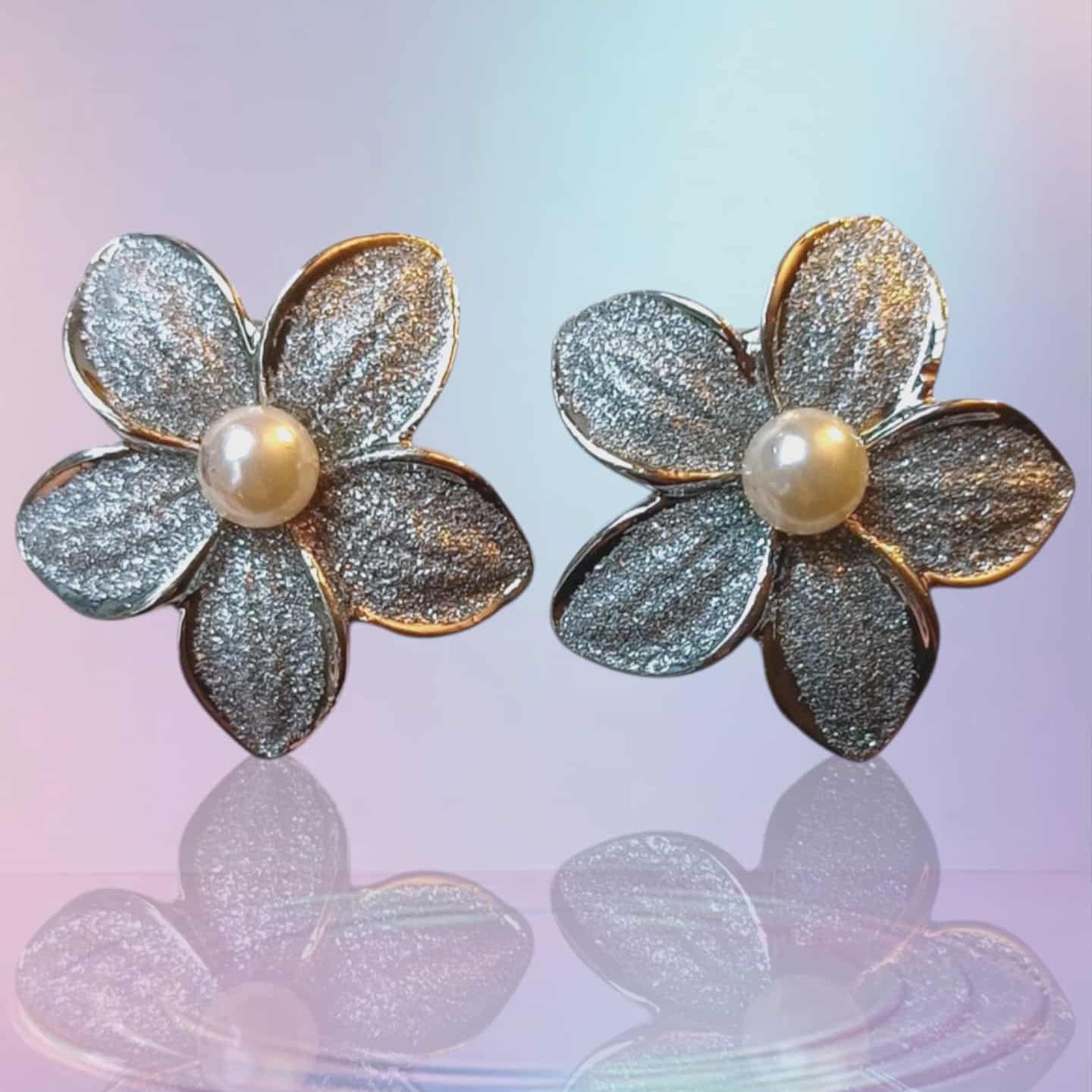 Et vakkert par blomsterøredobber i sølvfarget metall, utformet med fem kronblad som har en lett glitrende, teksturert overflate. I midten sitter en rund, kremfarget perledetalj som gir et delikat og elegant uttrykk.