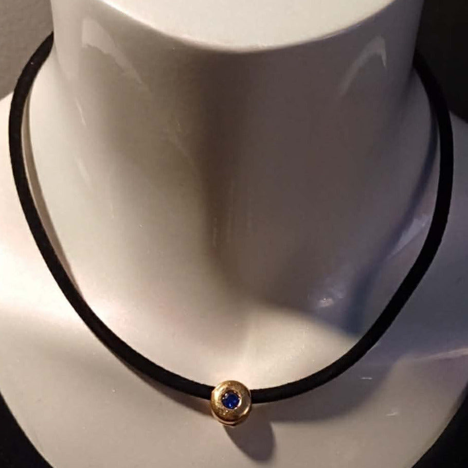 Et moderne smykke med klassiske detaljer som kombinerer minimalisme og farge i et stilfullt design. Det sorte, myke båndet fremhever midtpunktet – et sirkulært gullanheng prydet med en strålende blå sten. Kontrasten mellom den mørke basen og det glitrende senteret skaper en tidløs look som passer både til hverdag og fest. Smykket er utrolig fint på. Enkelt men sofistikert.