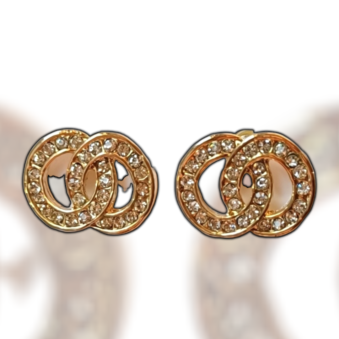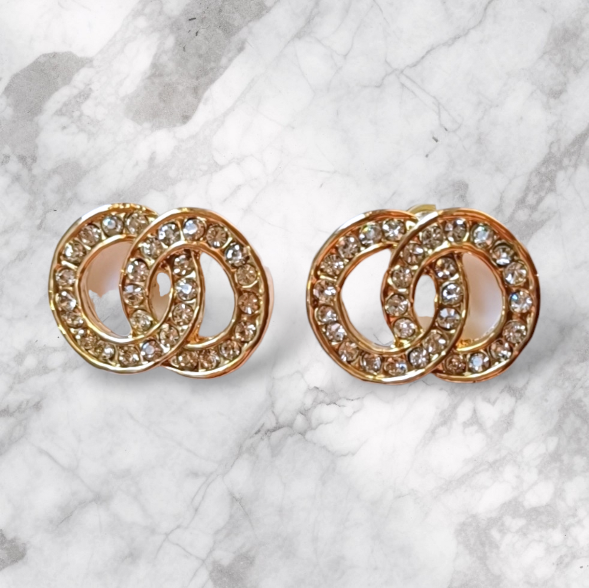 Elegante øredobber til hull, utformet i gullfarget metall med to sammenkoblede sirkler – hver sirkel utsmykket med klare, glitrende stener som gir et sofistikert og tidløst uttrykk.