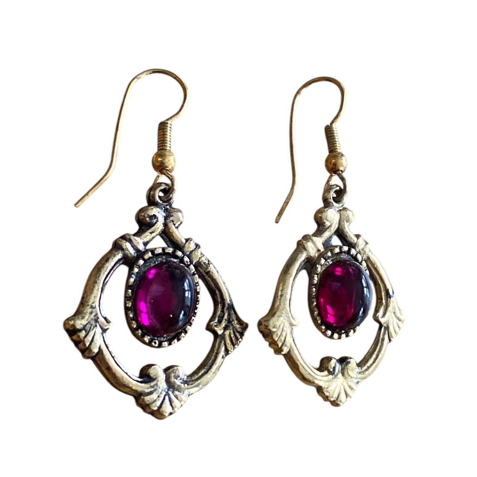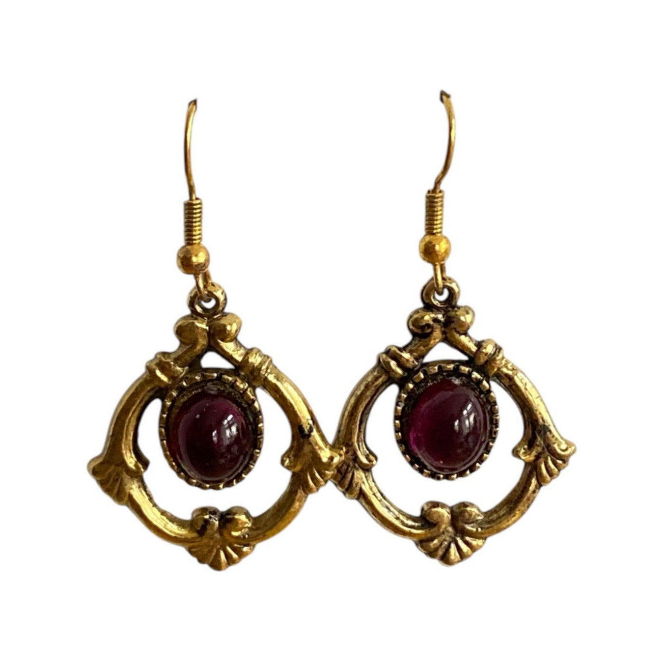 Elegante vintageøredobber med kroklås, dekorert med lilla glassten i midten. Stenen er innrammet av en gulltonet, ornamentert ramme med myke, klassiske former som gir et romantisk og tidløst uttrykk. Et smykke som passer like godt til hverdags som til fest, og som tilfører antrekket klassisk eleganse.