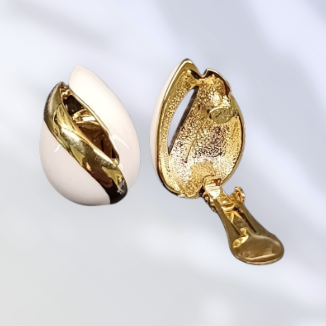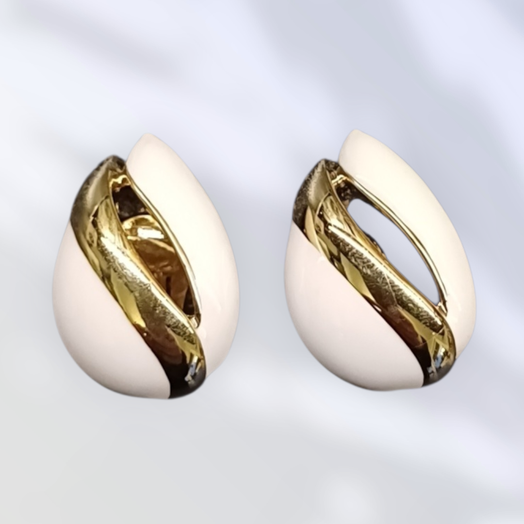 Et elegant par dråpeformede klipsøredobber i en ren, hvit finish kombinert med en vakker gullfarget buet detalj som slynger seg diagonalt over forsiden. Formen er myk og klassisk, mens metallaksenten gir et eksklusivt og moderne uttrykk. Perfekte både til hverdags og til mer pyntede anledninger.