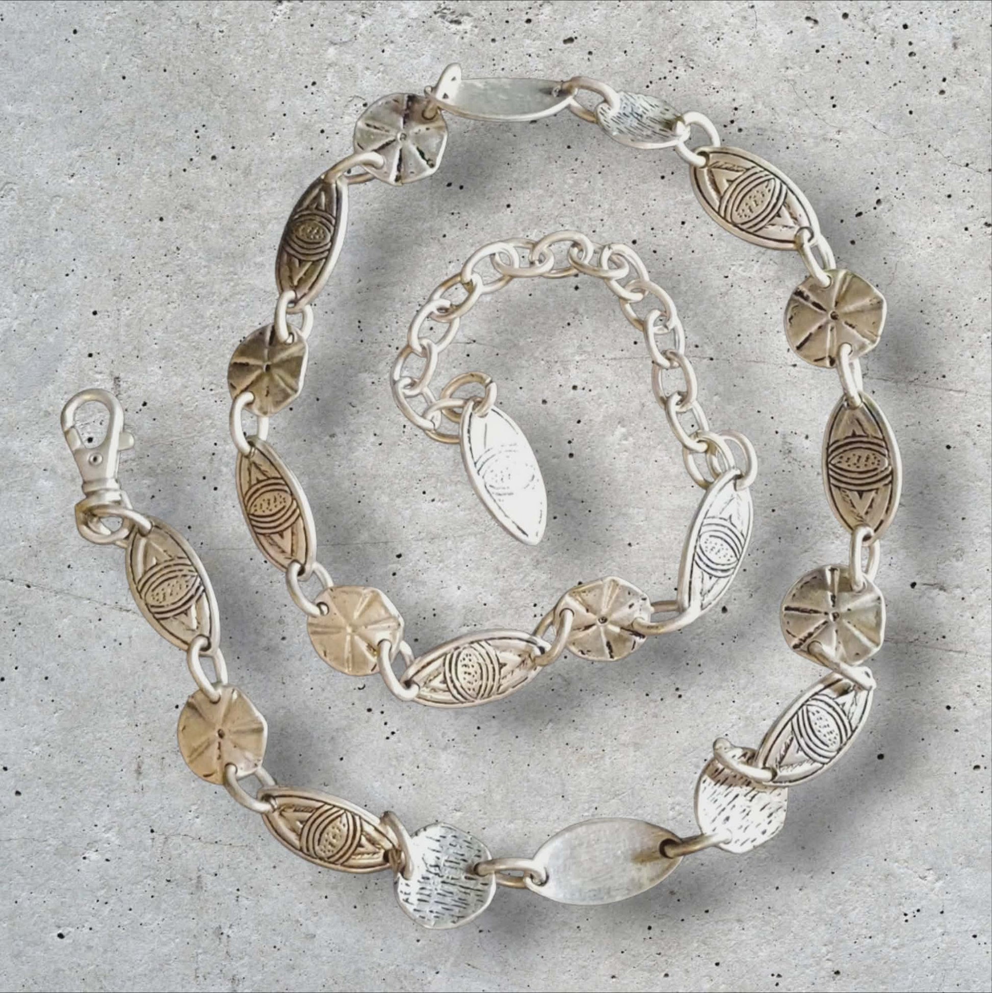Dette elegante vintagebeltet består av dekorative, sølvfargede ledd i et vekslende mønster som gir beltet et rikt og håndverksinspirert uttrykk. Hvert ledd har sin egen struktur og ornamentering, noe som skaper et levende, men balansert helhetsinntrykk.