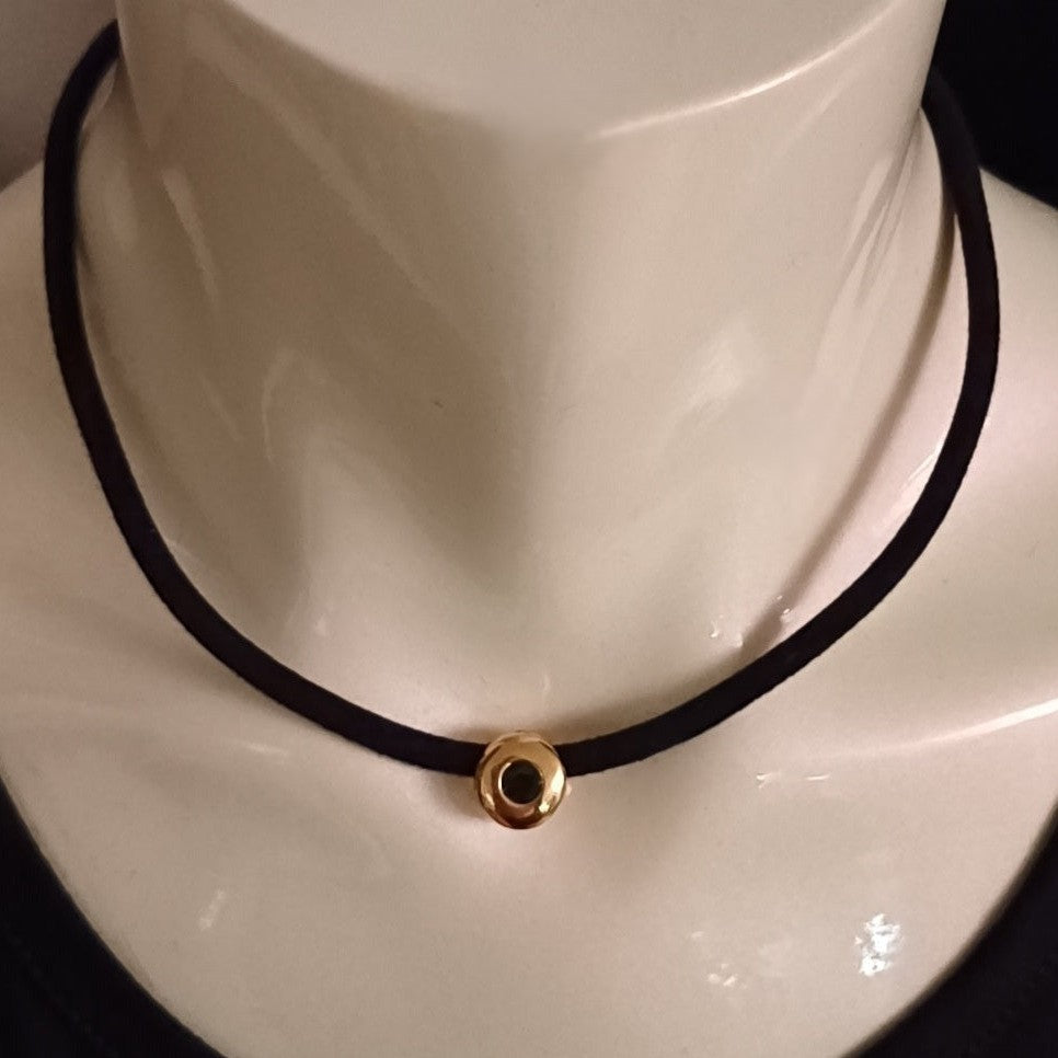 Et moderne smykke med klassiske detaljer som kombinerer minimalisme og farge i et stilfullt design. Det sorte, myke båndet fremhever midtpunktet – et sirkulært gullanheng prydet med en strålende grønn sten. Kontrasten mellom den mørke basen og det glitrende senteret skaper en tidløs look som passer både til hverdag og fest. Smykket er utrolig fint på, enkelt men sofistikert.