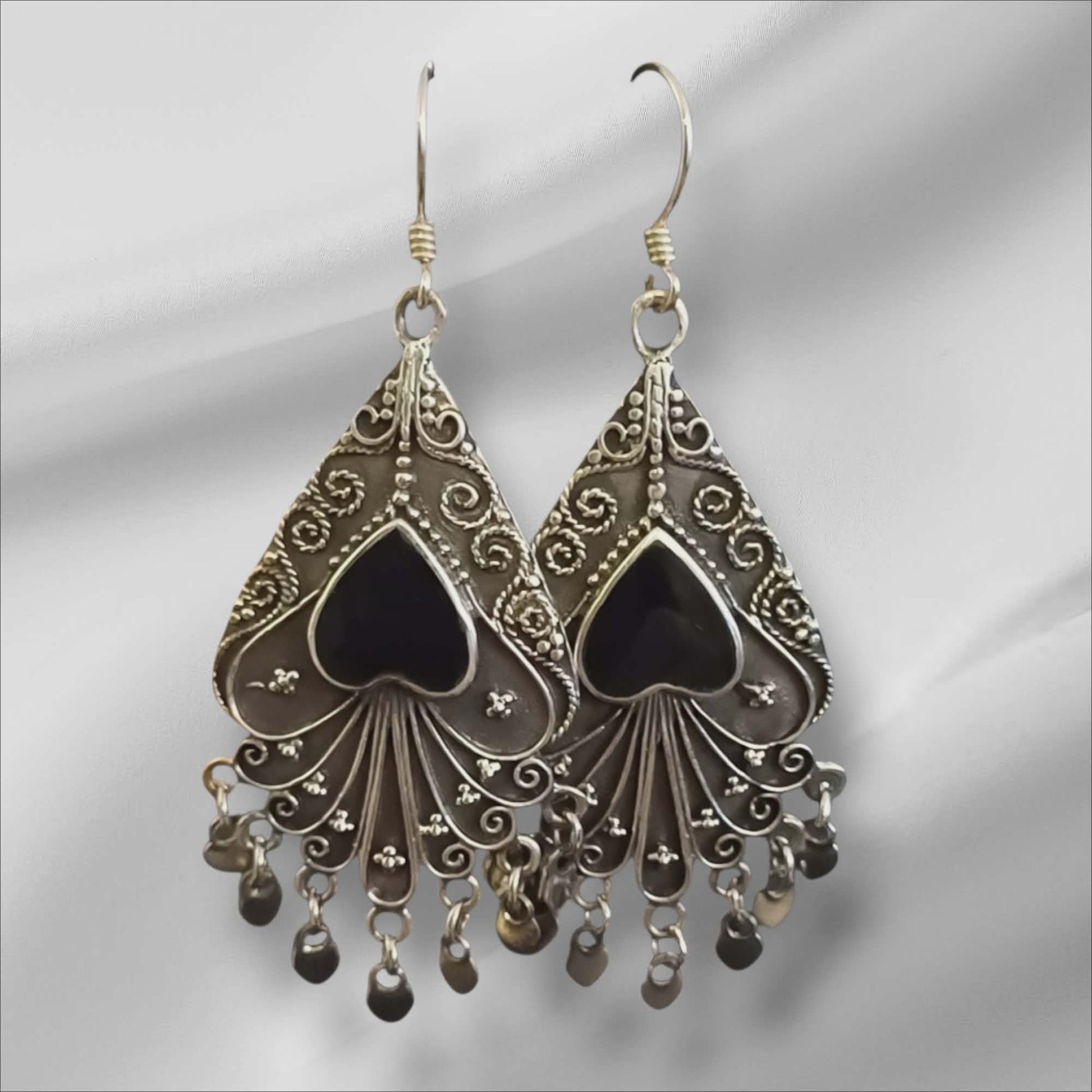 Nydelige, håndverksinspirerte filigran-øredobber i 925 sterlingsølv. Øredobbene har en dekorativ, tresidig formasjon øverst med delikate spiraldetaljer, og en sort midtdel formet som et hjerte som gir fint kontrastspill mot sølvet. Flere små ledd nederst gir en flott bevegelse. Stempelet «925» på baksiden bekrefter sterlingsølv-kvalitet.