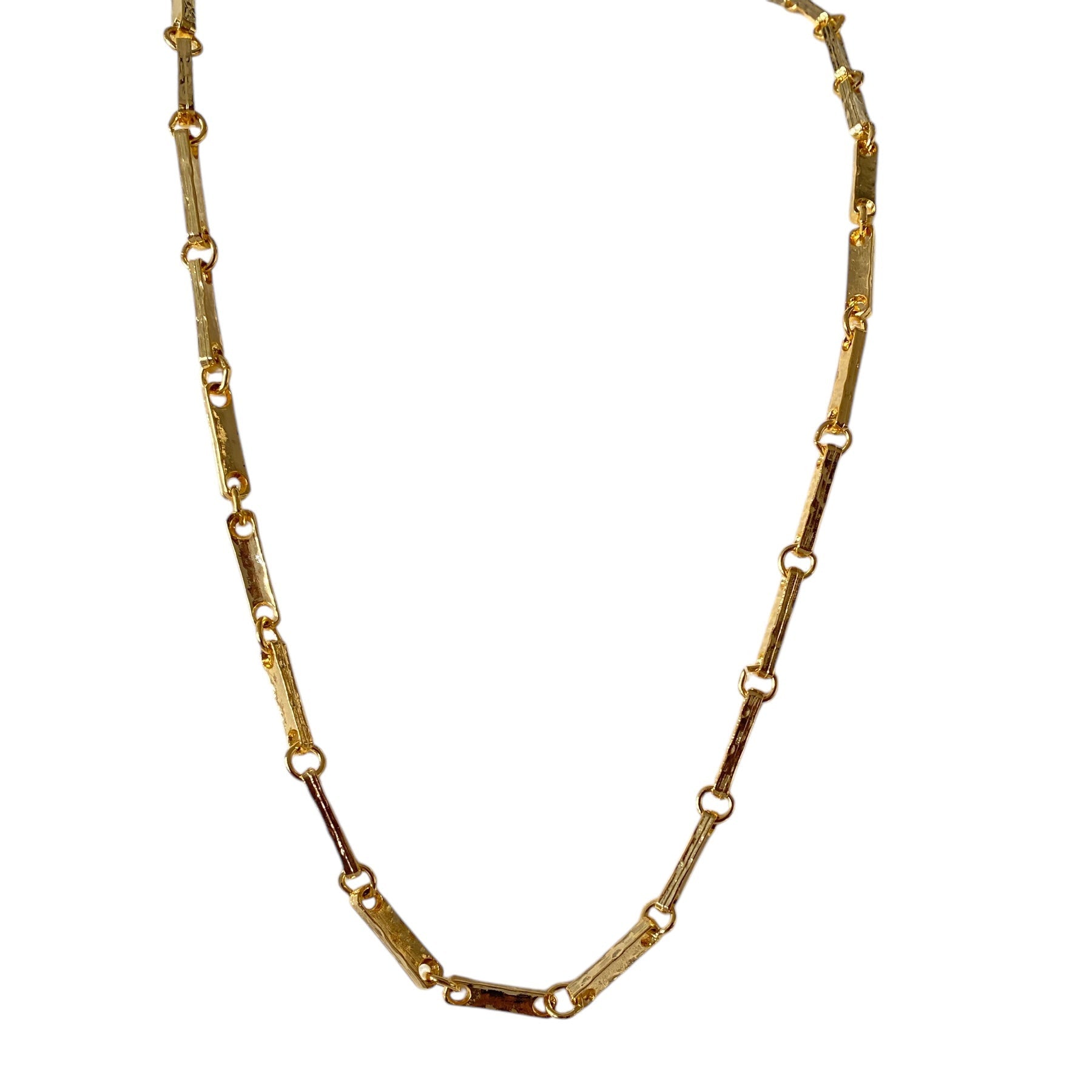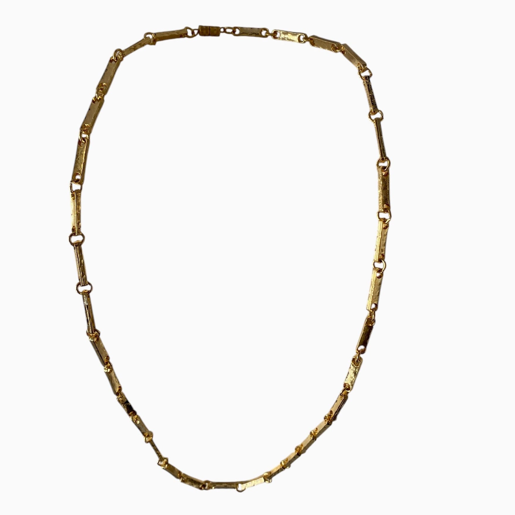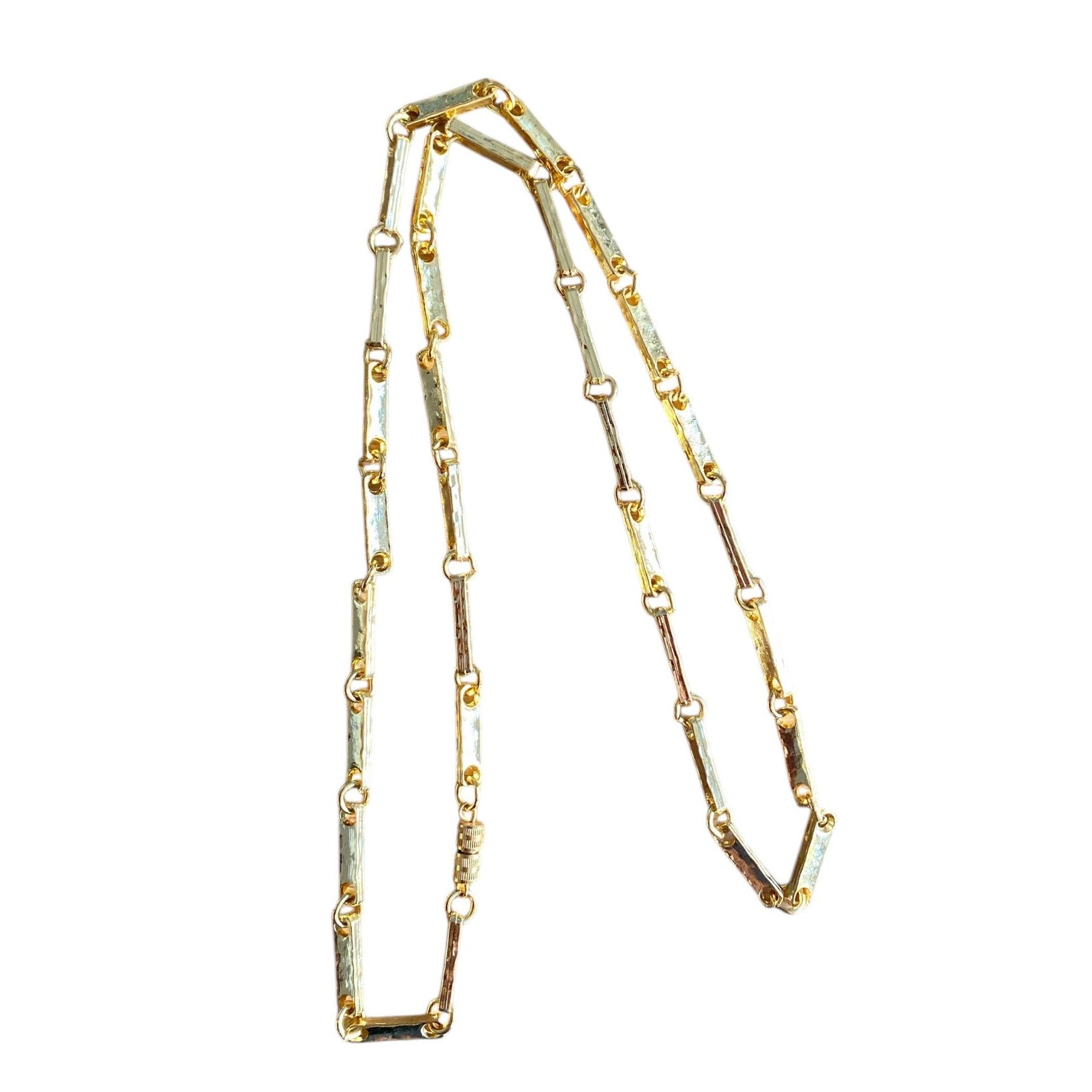 Et elegant vintagekjede i varm gullfarge, bygget opp av avlange, rektangulære ledd som skaper et rent og sofistikert uttrykk. Overflaten har en lett teksturert finish som gir et diskret spill i lyset og gjør kjedet både iøynefallende og klassisk på samme tid.