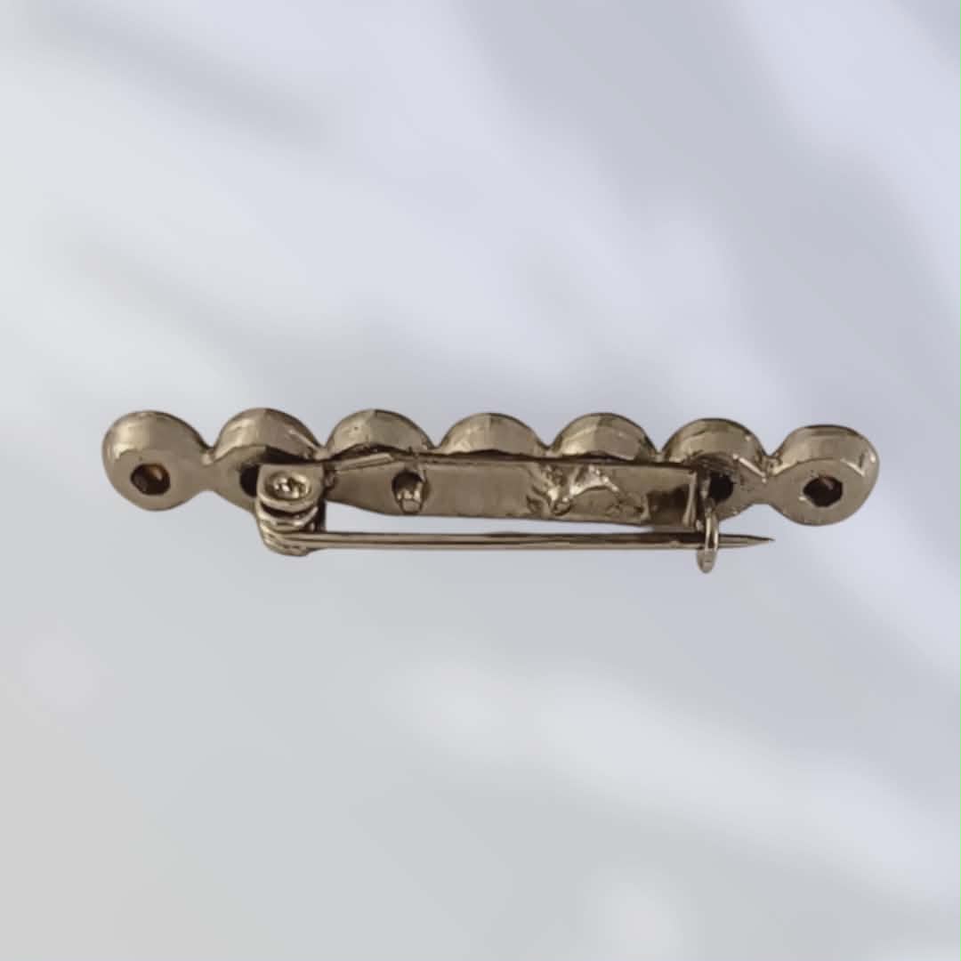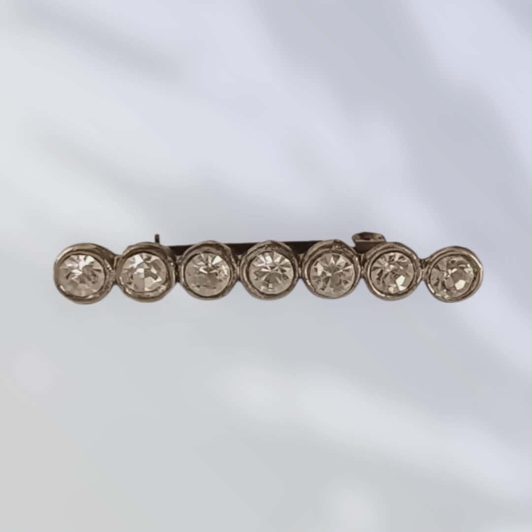 Elegant vintagebrosje med en rad av klare, hvite krystaller satt i metall. Det enkle, lineære designet gir et klassisk og stilrent uttrykk, samtidig som de blanke stenene tilfører et fint blikkfang. Perfekt til jakke, bluse eller skjerf for en subtil, men sofistikert detalj.